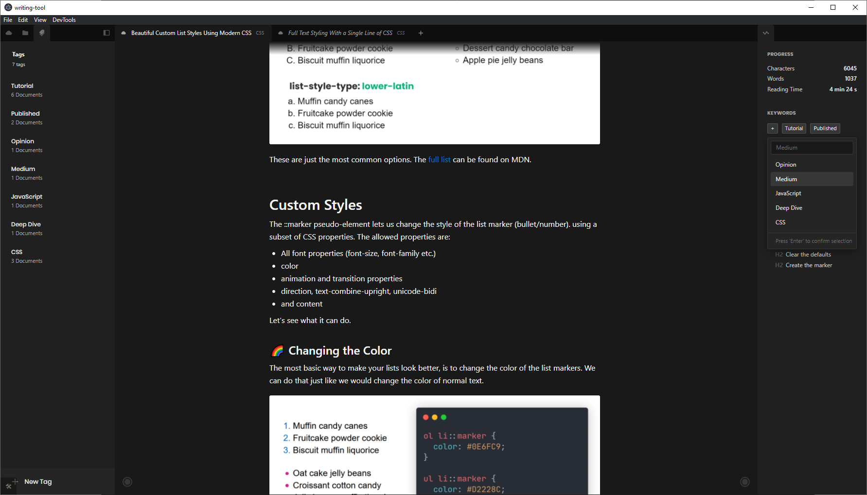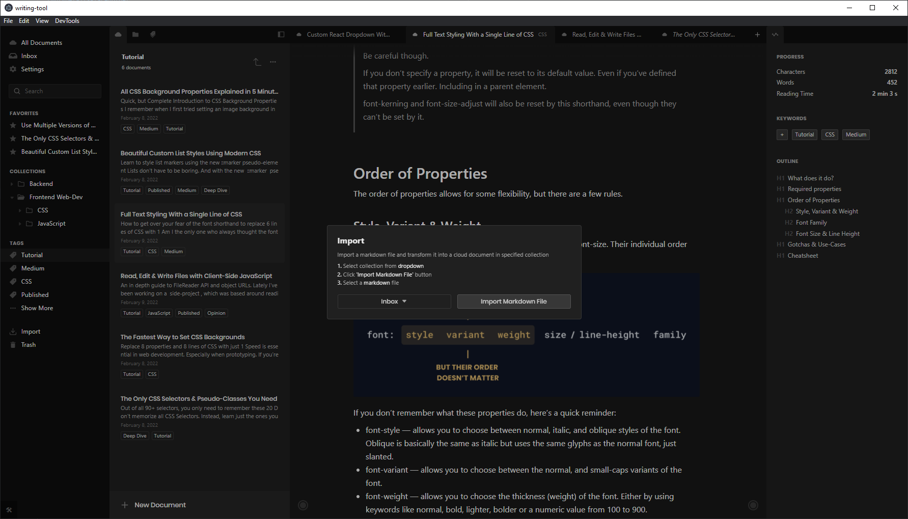 Data-ownership was another important aspect for me, which made me take a hybrid approach. The editor supports two types of documents: cloud and local. The former being stored in CouchDB and synced with an external server as well as the user’s other devices. The cloud documents also support additional features, like tags. All cloud documents can also be easily exported to markdown files and imported back.
