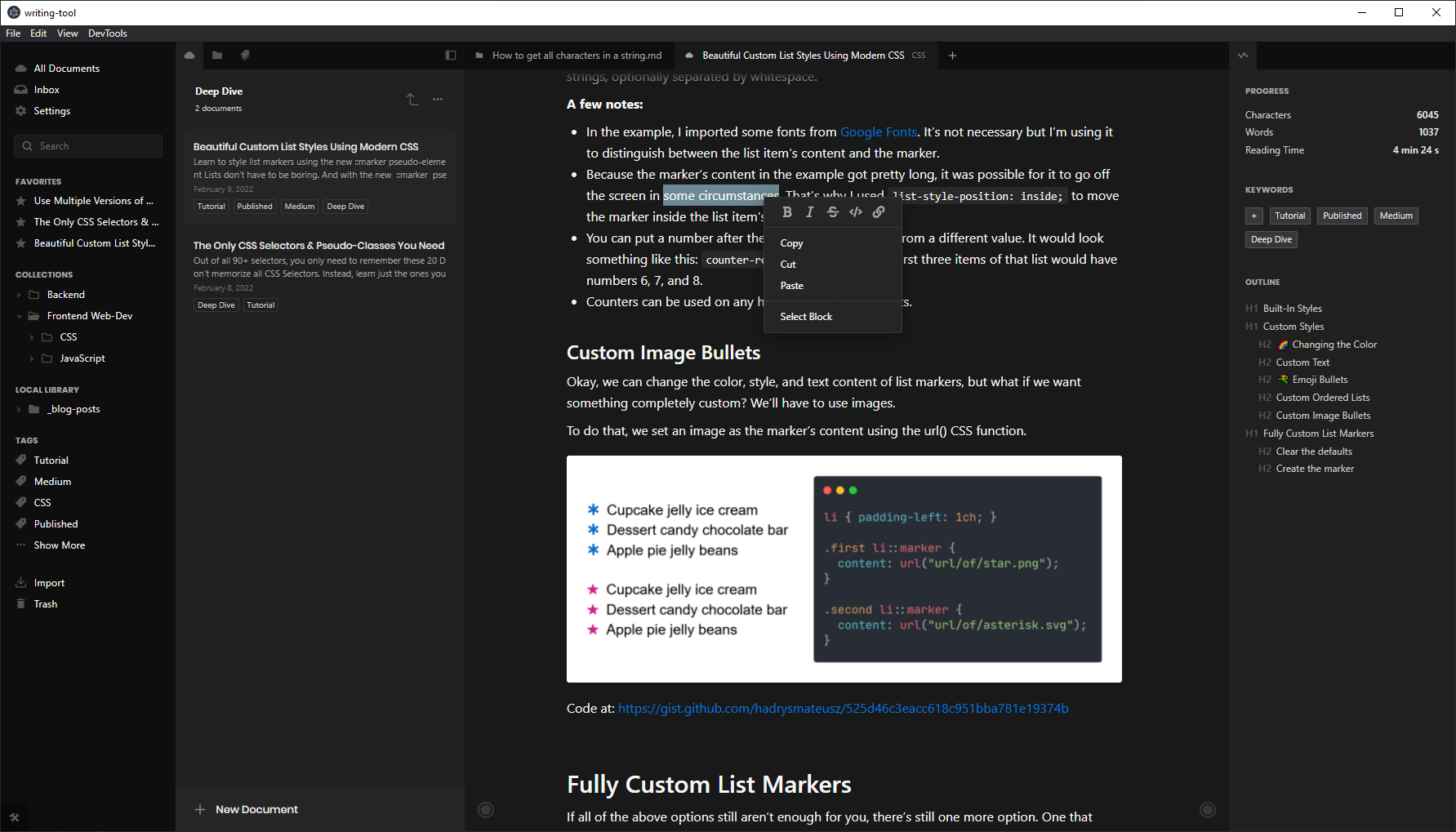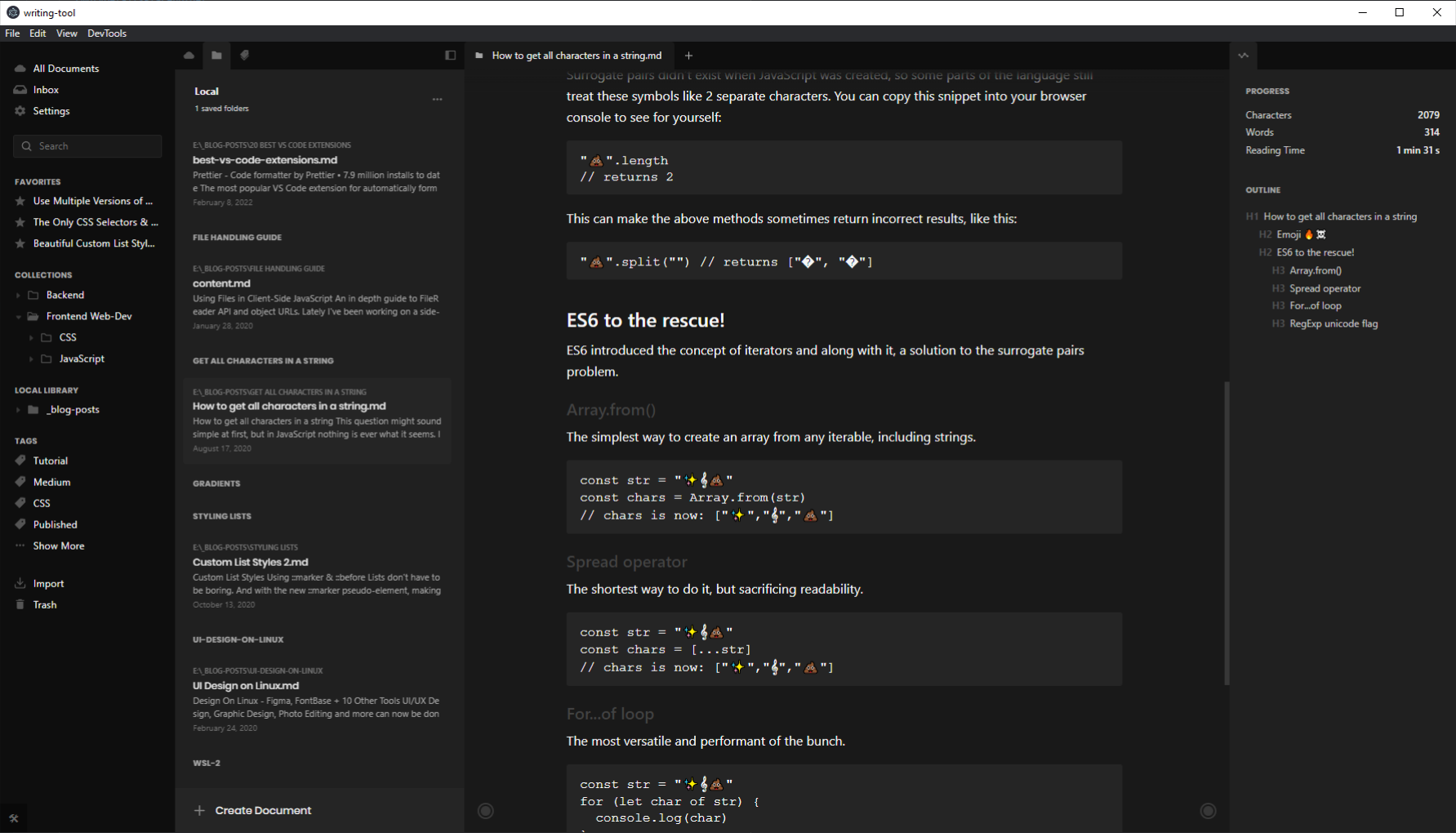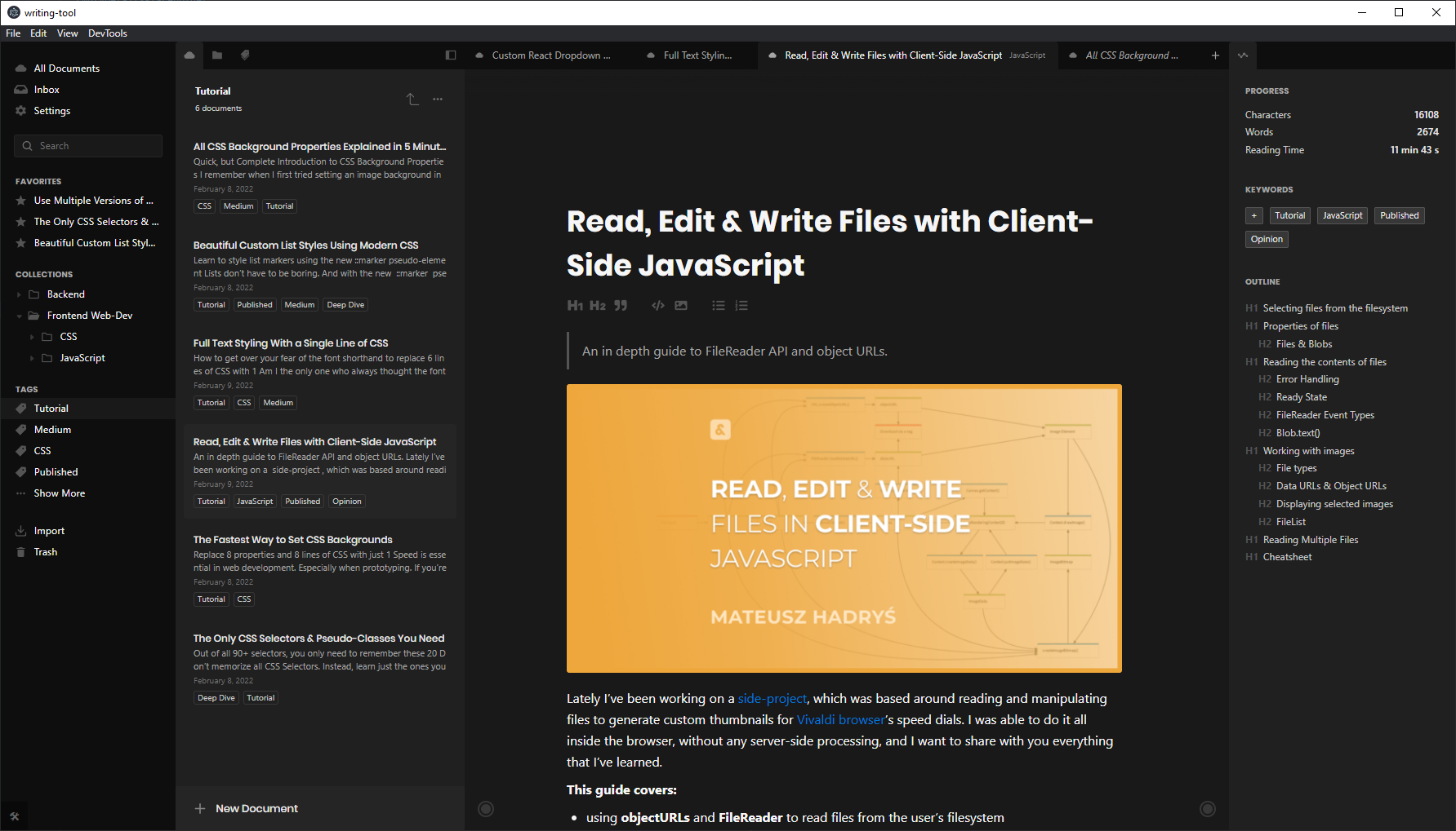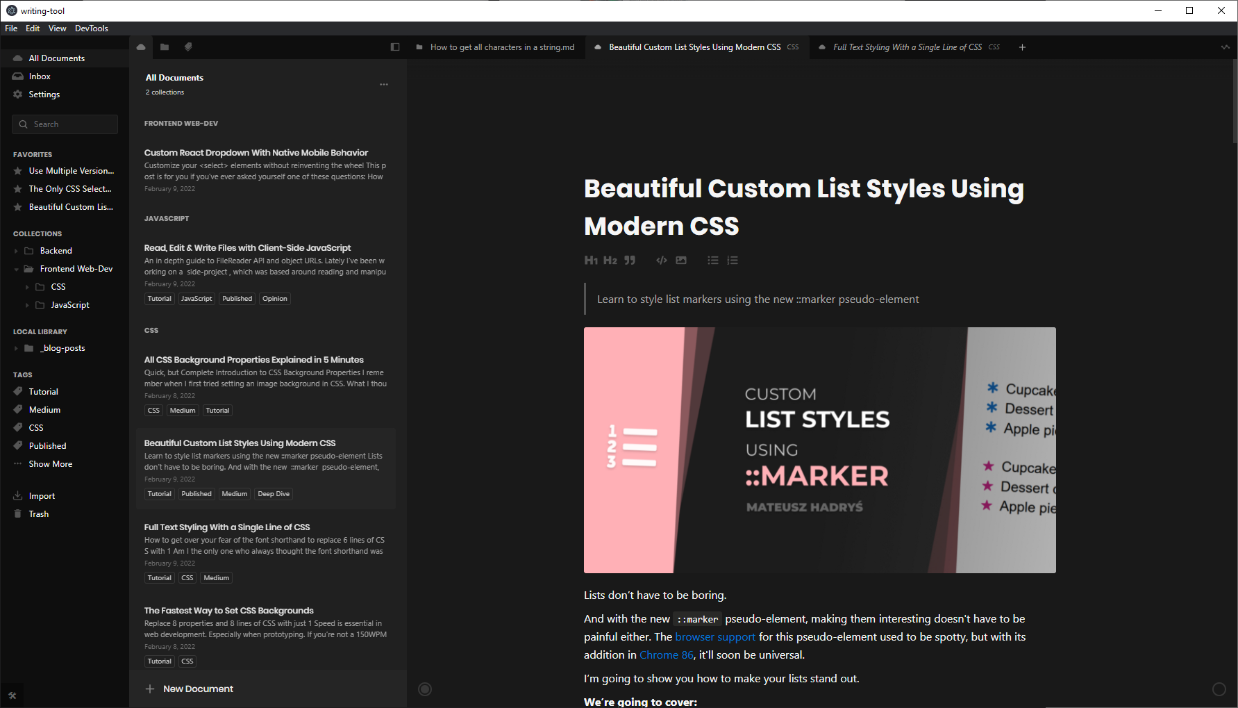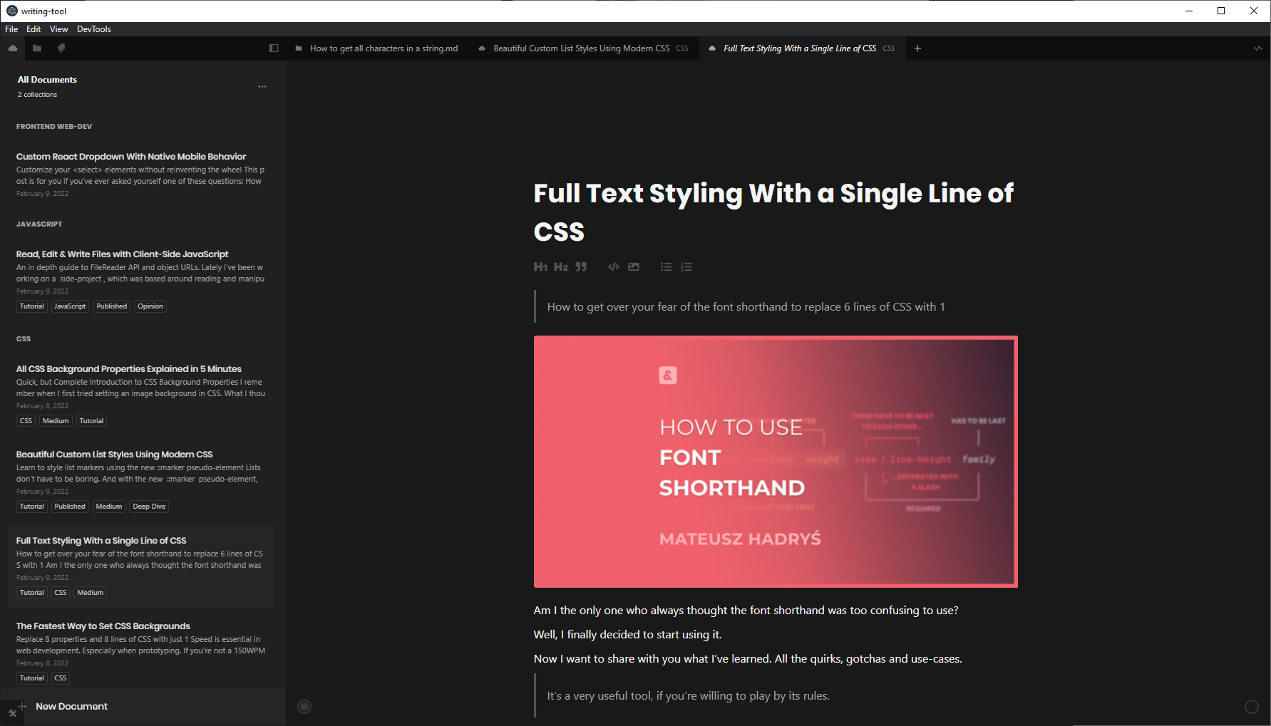 I created this project out of a personal need for good writing software. When I started sharing what I’ve learned in blog posts on Medium and Dev.to, I needed a place I could write and keep all of my blog posts organized.